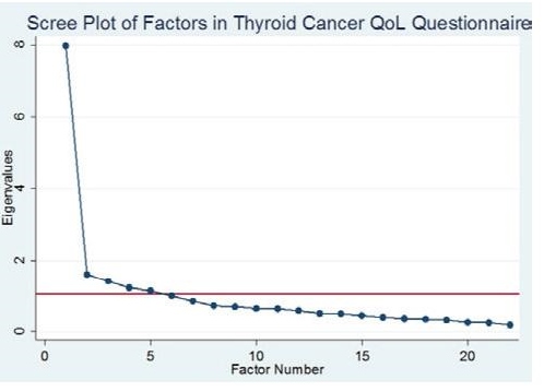 There were 5 factors or scales identified in this study. The scales all have good reliability and mostly good convergent validity (correlation of >0.4) with some exceptions in Factors 2 and 3 and good divergent validity (correlation of <0.4) with some exceptions in the 5 factors which may be explained by loading of some items in more than 1 factor. Thus, all the items were retained. Spearman correlation between the EORTC QLQ-C30 and the developed thyroid cancer questionnaire was weak which indicates that there is no redundancy between the two questionnaires. Thus, the developed and validated thyroid cancer HRQoL questionnaire can be used in combination with the EORTC QLQ-C30 for patients with DTC.