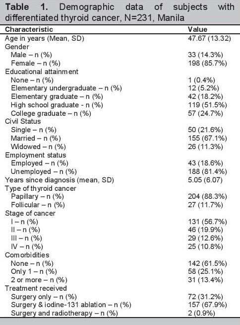 Phase IVValidation was done in 231 patients with DTC. Table 1 shows the demographic data of the subjects. Of the 231 participants, 33 (14%) were men and 198 (86%) were women. The mean age of participants was 47.67±13.32 years (range 19-79 years). Fifty (22%) were single, 155 (67%) were married, and 26 (11%) were widowed. They possessed varying degrees of formal education, with one having no formal education at all, 12 (5%) were elementary undergraduates, 42 (18%) were elementary graduates, 119 (52%) were high school graduates, and 57 (25%) were college graduates. Eighty-one percent was unemployed. Time since diagnosis of thyroid cancer ranged from 29 days to 42 years, with a mean time of 5.05±6.07 years. Two hundred four (88%) had papillary type of thyroid cancer and 27 (12%) had follicular type. The participants had different stages of cancer: 131 (57%) were stage 1, 46 (20%) were stage 2, 29 (13%) were stage 3, and 25 (11%) were stage 4. While 61% had no comorbidity, 25% had one and 13% had two comorbidities. All participants underwent surgery. Of these, two (0.87%) also had radiotherapy and 157 (68%) had iodine-131 ablation.