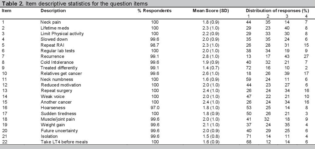 Phase IV: Validation of the Pre-final QuestionnaireThe resultant pre-final questionnaire was validated in a sample of well differentiated thyroid cancer patients (at least 10 patients per question item based on the recommendation by Nunnally[12]). These subjects included a diverse group of DTC patients [with representatives from the different types of differentiated thyroid cancer (i.e., papillary and follicular thyroid cancer), from the different stages of the cancer, from age groups <45 and 45 or greater, and from patients <10 years and 10 or more years from diagnosis], not involved in the previous phases of the study, from both charity and pay patients who consulted at the outpatient clinic or were admitted at the Philippine General Hospital. The subjects first completed the EORTC QLQ-C30 before answering the pre-final version of the questionnaire.