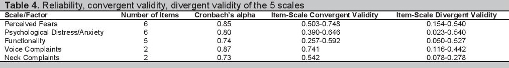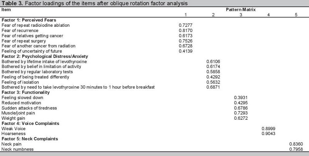 Oblique rotation to determine factor loadings of each item was done (Table 3). The items that had high factor loadings (>0.35) in the same factor were grouped together indicating that these items may reflect a related groups of symptoms or complaints. Factor 1 is defined by items relating to perceived fears of the patients. Factor 2 is composed of items relating to psychological distress or anxiety. Factor 3 includes items relating to functionality of patients. Factors 4 and 5 are items dealing with voice complaints and neck complaints, respectively. Some items had high item loadings in more than 1 factor but were assigned to the factor with the items they are more compatible with. The item for cold intolerance did not have high loading in any of the factors and thus was considered as a single item. Click here to download Table 3