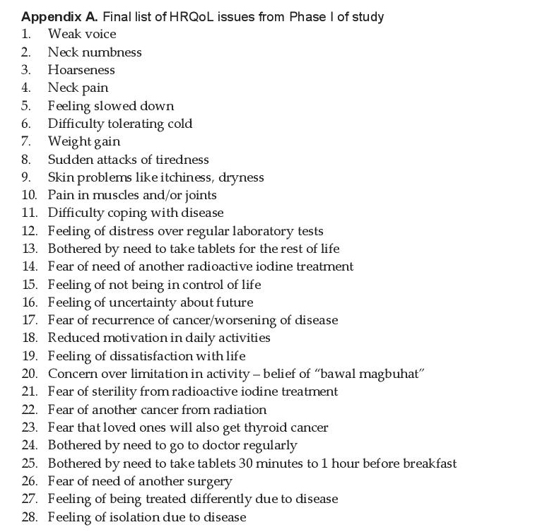 Results. In Phase I, 28 HRQoL issues were generated. In Phase II, a 28-item Filipino questionnaire was created. In Phase III, 22 items that were not upsetting or confusing to patients and with good range of responses were retained. After Phase IV, a 22-item questionnaire with 5 conceptual scales (perceived fears, psychological distress/anxiety, functionality, voice complaints, neck complaints) was created.