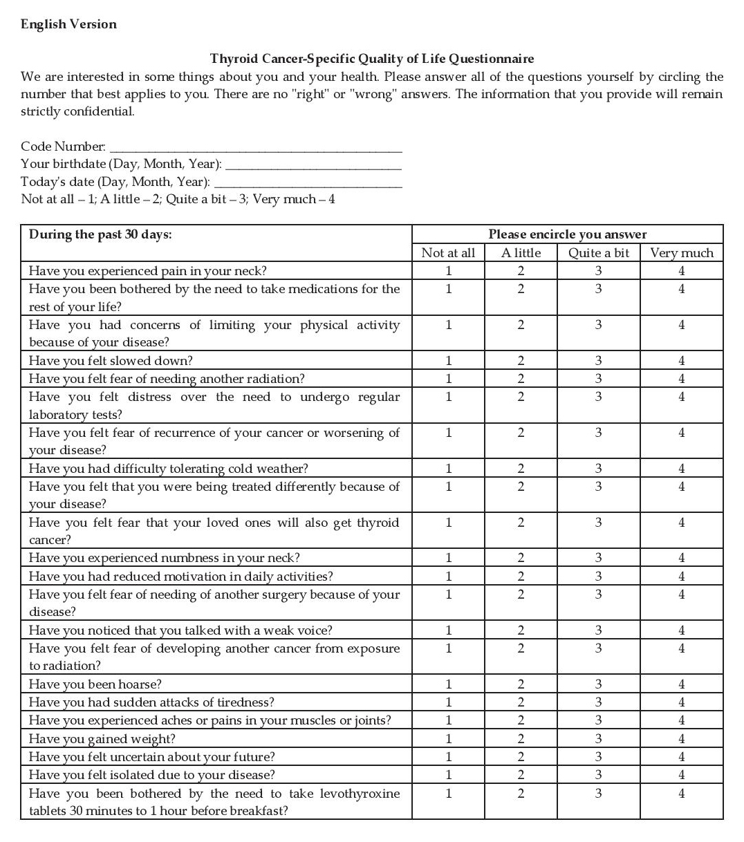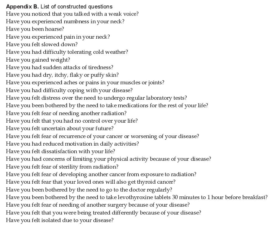 Phase IIIPretesting was done on 15 thyroid cancer patients. Patients did not find any annoying, confusing, upsetting, intrusive or irrelevant questions. They also did not think there were missing items from the list. There were no identified problems with the phrasing of the questions. Patients finished the questionnaire with an average time of 6 minutes, with a range of 3 to 9 minutes.