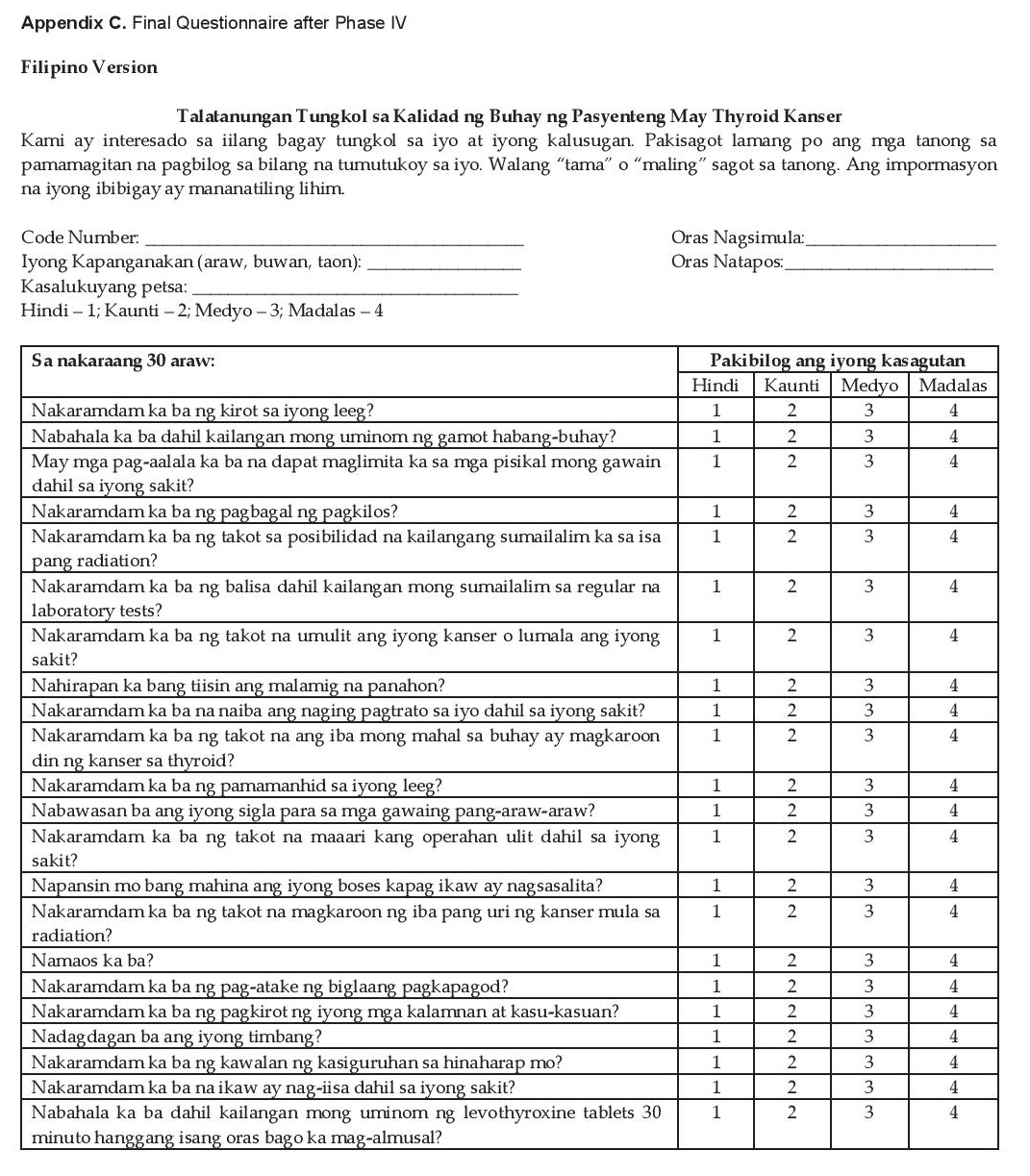 Because of the usually good prognosis and prolonged life of thyroid cancer patients compared to other cancer patients, using the final questionnaire (see Appendix C for the Filipino and English versions of the final questionnaire) to assess their quality of life is of value for physicians to guide therapy. Care of these patients can be improved based on their perceived HRQoL.