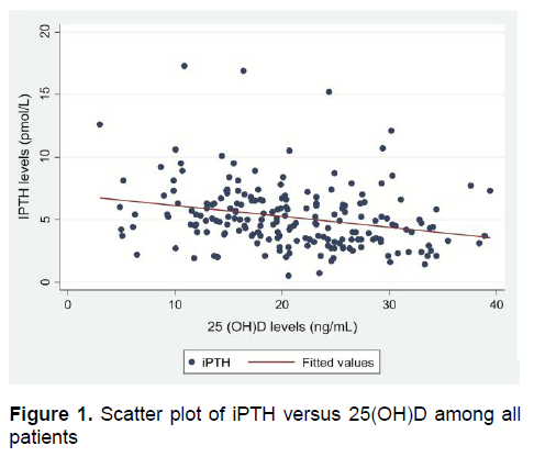 Figure 1. Scatter plot of iPTH versus 25(OH)D among all patients