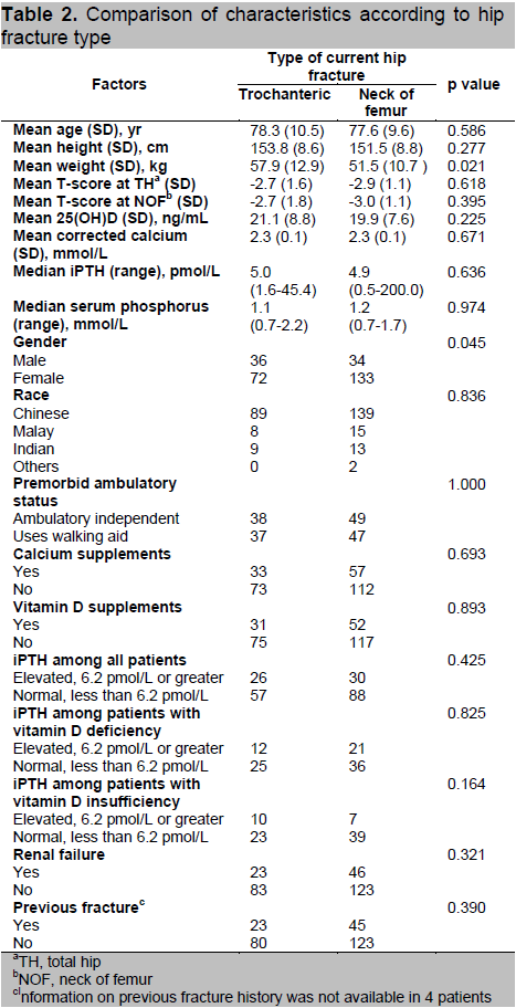 Objective. Limited information exists on the physical characteristics, bone mineral density (BMD), 25-hydroxyvitamin D [25(OH)D] levels and other biochemical parameters in patients with hip fractures in Asia. We aimed to explore whether these parameters differ between trochanteric and femoral neck (cervical) hip fractures in Singaporean patients.