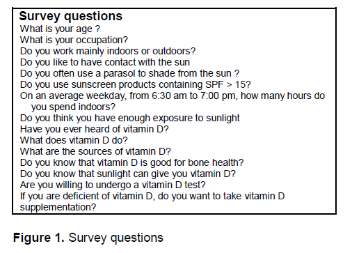 Methodology. The study was designed as a cross-sectional survey of a population in Ho Chi Minh City, Vietnam. Study participants were randomly drawn from the general community, supermarkets and hospital visitors. Each participant was given a questionnaire relating to knowledge on vitamin D and behavior toward sunlight exposure. The questionnaire was previously tested for reliability and accuracy in 20 participants.