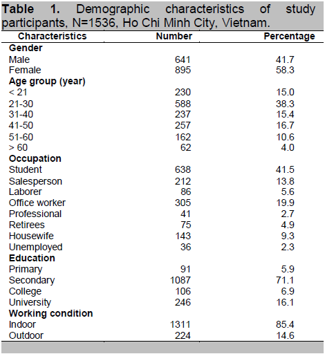 A total of 1536 participants between 18 and 85 years of age were surveyed (Table 1). The average age of the participants was 34 ± 14 years (mean ± SD). Majority of participants were female (58.3%), students (41.5%), with secondary education (71.1%), and worked indoors (85.4%).