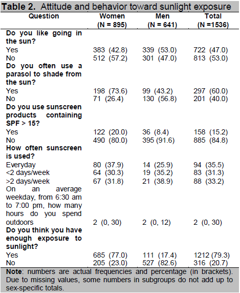On average, the participants spent approximately 14 hours per week exposed to the sun. Around 77% of women and 17.4% of men reported that they had adequate exposure to sunlight. Approximately 60% of participants reported that they often used parasols, and 15% often used sunscreen products with sun protection factor (SPF) greater than 15.