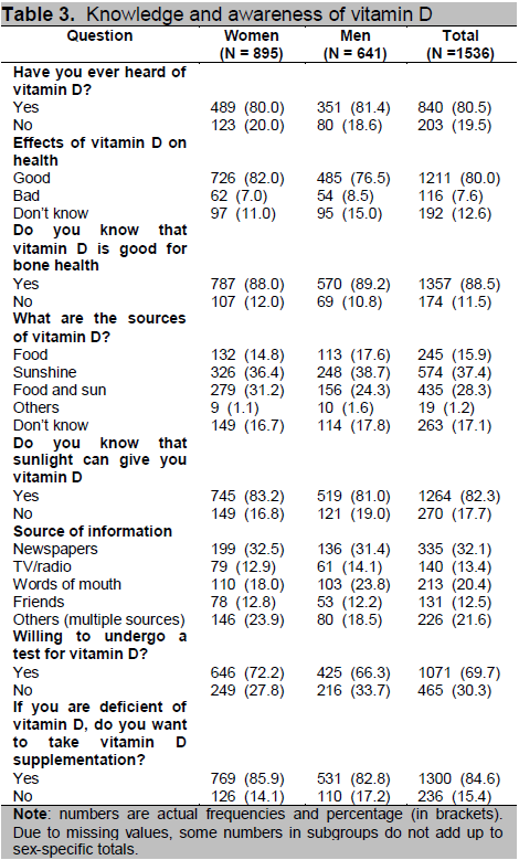 A significant majority of women (80%) and men (81.4%) reported that they had heard of vitamin D. Usual sources of information were newspapers (32%), friends (20%), radio and television (13%), and other sources, including the internet. However, knowledge about the source of vitamin D was not adequate : 37% thought that vitamin D comes from the sun, another 28% thought that the sources of vitamin D are foodstuff and the sun, and 17% did not know the source of vitamin D (Table 3).