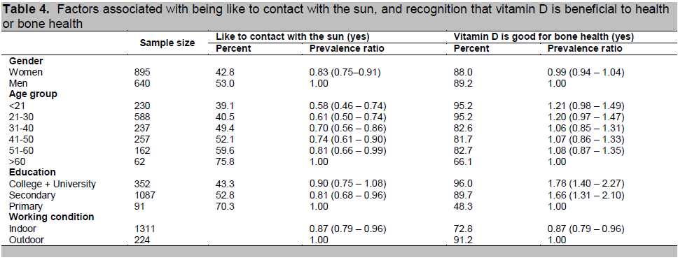 Table 4. Factors associated with being like to contact with the sun, and recognition that vitamin D is beneficial to health or bone health