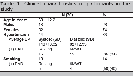 In Table 1, the mean age of participants is 60 years (SD + 12.2). Fifty-two were females (74%), 18 were males (26%). Sixty-three percent were hypertensive, average systolic and diastolic blood pressure was 140 + 18.82 and 82+12.39 respectively. Sixteen (36%) participants who were hypertensive are positive for PAD at rest. Of the 14% who were smokers, half were positive for PAD at rest.