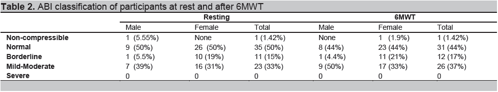 In Table 2, resting ABI revealed the following results: 1(1.42%) was non-compressible, 35(50%) normal, 11(15%) borderline, and 23(33%) had mild to moderate PAD. After 6MWT, results showed that 1(1.42%) was non-compressible, 31(44%) normal, 12(17%) borderline, 26(37%) had mild to moderate PAD. No participants were classified as severe at resting and after 6MWT.Among males 7 (39%) were classified as mild-moderate at rest as compared to 9 (50%) after the 6MWT. Among females 16 (31%) were classified as mild-moderate at rest as compared to 17 (33%) after the 6MWT.