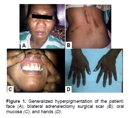 Figure 1. Generalized hyperpigmentation of the patient: face (A), bilateral adrenalectomy surgical scar (B), oral mucosa (C), and hands (D).