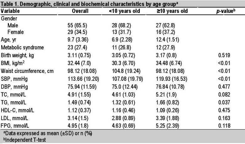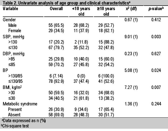 Results. Majority of subjects in both age groups were boys, with 68.2% <10 years old. Mean age was 9.69 years (±3.36). The clinical and biochemical parameters of metabolic syndrome were similar between those <10 years old and >10 years, with the exception of BMI, waist circumference, SBP and TG level. Multivariate regression analysis showed that the parameters of metabolic syndrome significantly associated with age ≥10 years were systolic hypertension (adjusted OR 7.17, 95% CI, 1.48 to 34.8) and BMI >30 kg/m2 (adjusted OR 3.02, 95% CI, 1.16 to 7.86).