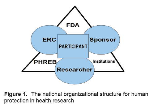 Structurally, the PHREB became one of the 3 regulatory bodies on human protection in research; the others being the Food and Drug Administration and research institutions themselves (Figure 1). The second level of control in human protection lies on the researcher, the sponsor and the ethics review committee. At the center, representing the first level of protection, is the research participant/patient.