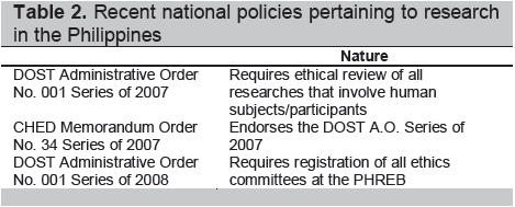 4. The organization of a Research Ethics Training group, composed of the UPM-NIH, the University of the Philippines Bioethics Group, the Southeast Asia Bioethics Organization, the University of Santo Tomas Bioethics Group and the PHREB Sub-Committee on Training, which has agreed on a common research ethics training curriculum.