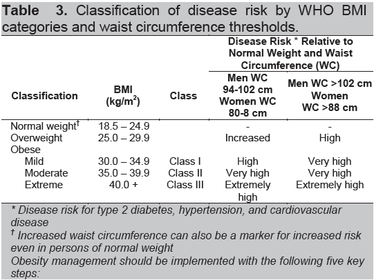 Table 3. Classification of disease risk by WHO BMI categories and waist circumference thresholds.