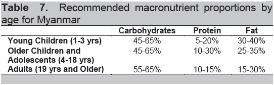 Table 7. Recommended macronutrient proportions by age for Myanmar