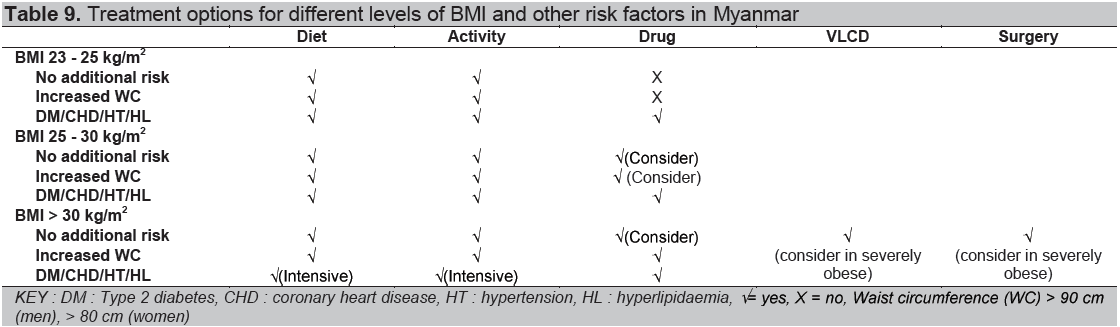 Table 9. Treatment options for different levels of BMI and other risk factors in Myanmar