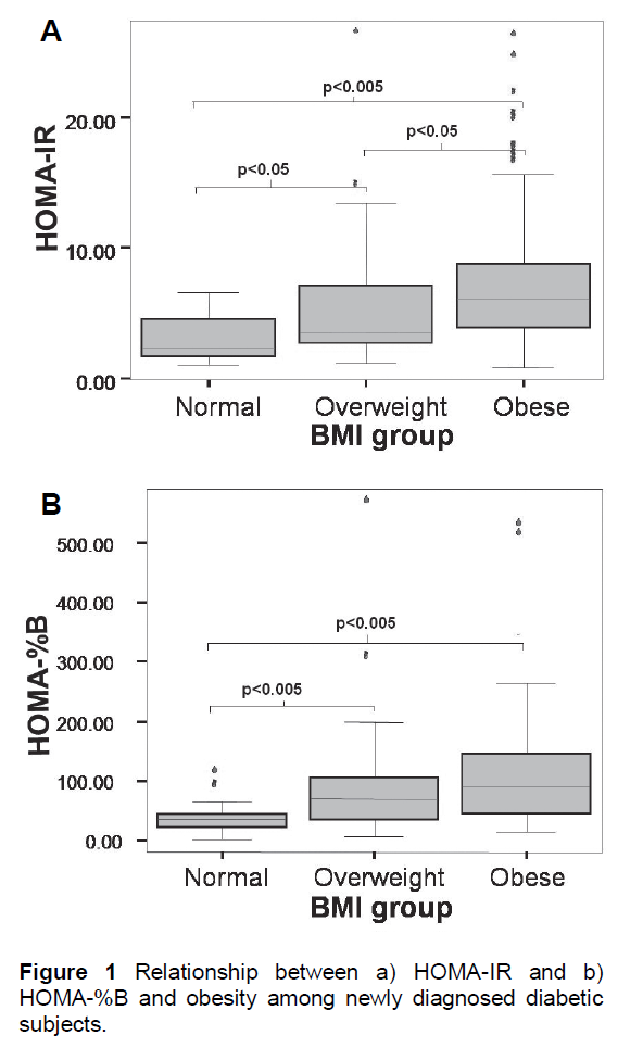 Figure 1 Relationship between a) HOMA-IR and b) HOMA-%B and obesity among newly diagnosed diabetic subjects.