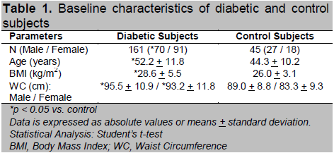 A total of 161 diabetic subjects aged 25-81 years were recruited, 60.9 % being Malay, 19.9 % Chinese, 18.6 % Indian and 0.6% others. Majority (74.5%) of the diabetic subjects were diagnosed via routine screening when they visited the primary care clinics for other conditions associated with diabetes, e.g. hypertension and dyslipidaemia, and they were diagnosed by two FPG of > 7 mmol/L (41%) or by oral glucose tolerance test (33.5%) when the FPG is impaired as defined by > 5.6 mmol/L. Only 25.5% of the diabetic subjects presented with symptomatic hyperglycaemia with a random plasma glucose of > 11.1 mmol/L upon diagnosis. Of note is that the majority of the diabetic subjects were overweight/obese with a mean BMI of 28.6 + 5.5 kg/m2. More than half, 85 (52.8 %) of them were obese (BMI > 27.5) while 59 (36.6 %) were overweight (BMI 23-27.5) as defined by the National Clinical Practice Guidelines on Management of Obesity of Malaysia (11). Using the Asian cut off point of 90 cm for male and 80 cm for female for central obesity, 121 (75.2 %) of the diabetic subjects were centrally obese (12). A total of 93 subjects (57.8 %) had positive family history of T2DM in first-degree relatives and 99 (61.5 %) were hypertensive (defined by a blood pressure of > 130 mmHg systolic and or > 85 mmHg diastolic or were on antihypertensive medications). Dyslipidaemia, defined as fasting serum triglyceride (TG)3 1.7 mmol/L or high-density lipoprotein (HDL) cholesterol < 1.04 mmol/L in male and 1.30 mmol/L in female was present in 100 (62.1 %) of the diabetic subjects. A total of 45 control subjects aged 25-72 years old were also recruited concurrently from healthy volunteers. Of these, 24 (53.3%) were overweight while 14 (31.1%) were obese. The baseline characteristics of the diabetic and control subjects are summarized in Table 1.