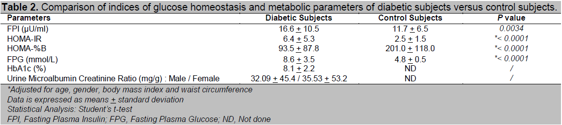 Table 2. Comparison of indices of glucose homeostasis and metabolic parameters of diabetic subjects versus control subjects.