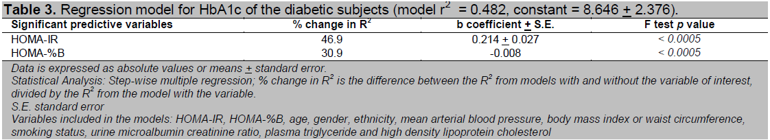 Table 3. Regression model for HbA1c of the diabetic subjects (model r2 = 0.482, constant = 8.646 + 2.376).