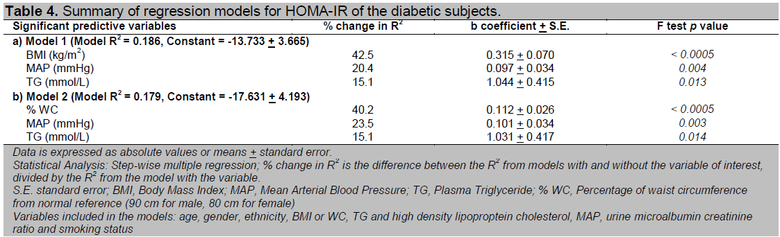 Table 4. Summary of regression models for HOMA-IR of the diabetic subjects.