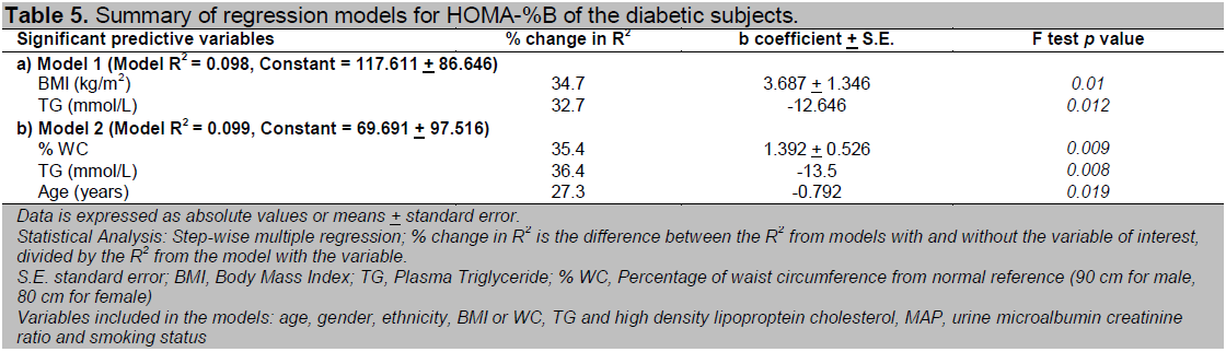 Table 5. Summary of regression models for HOMA-%B of the diabetic subjects.