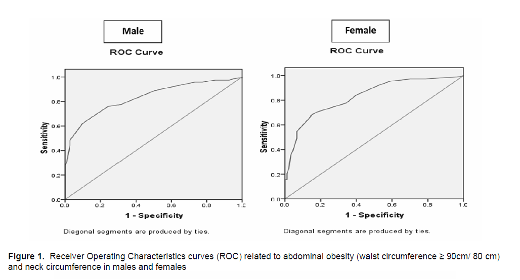 Figure 1. Receiver Operating Characteristics curves (ROC) related to abdominal obesity (waist circumference ≥ 90cm/ 80 cm) and neck circumference in males and females