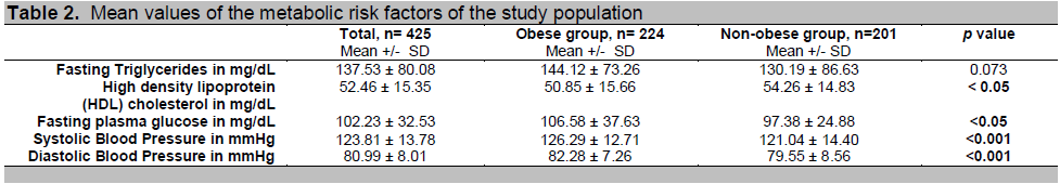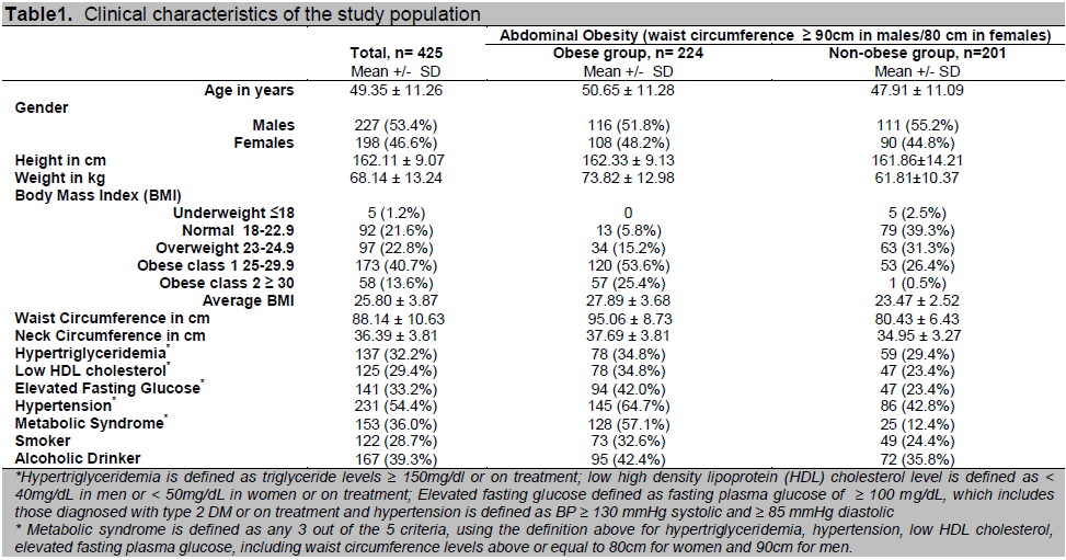 A total of 425 patients, 227 males and 198 females, participated in the study. Of the 425 patients, 224 patients were obese by abdominal circumference, while 201 patients were not obese by abdominal circumference. Table 1 depicts the demographic profile and clinical characteristics of the study population. The mean age of the study population was 49.35 ± 11.26 years with predominance of males over females. The study population belonging to the obese group were heavier, had a larger WC and a higher BMI. Most of the patients in the obese group fall under the obese class 1 classification (53.6%, 120 out of 224 patients) as compared to the non-obese group, who are mostly classified under normal (39.3%, 79 out of 201 patients).
