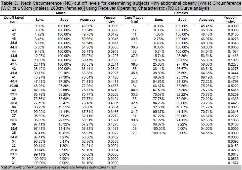 Table 3. Neck Circumference (NC) cut off levels for determining subjects with abdominal obesity [Waist Circumference (WC) of ≥ 90cm (males), ≥80cm (females)] using Receiver Operating Characteristic (ROC) Curve analysis