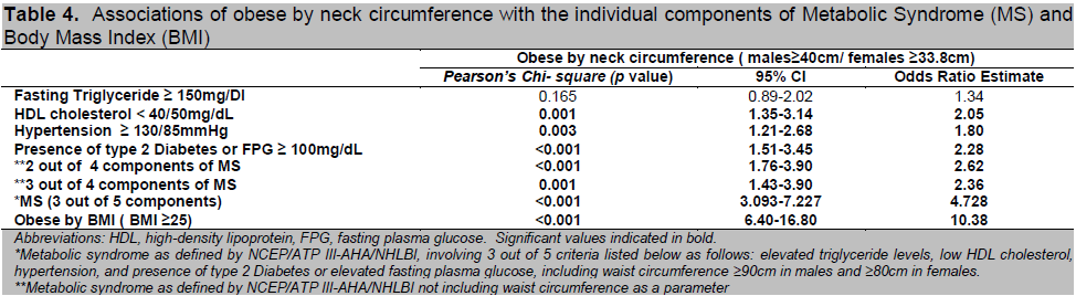 Table 4. Associations of obese by neck circumference with the individual components of Metabolic Syndrome (MS) and Body Mass Index (BMI)