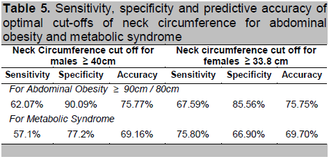 Table 5. Sensitivity, specificity and predictive accuracy of optimal cut-offs of neck circumference for abdominal obesity and metabolic syndrome