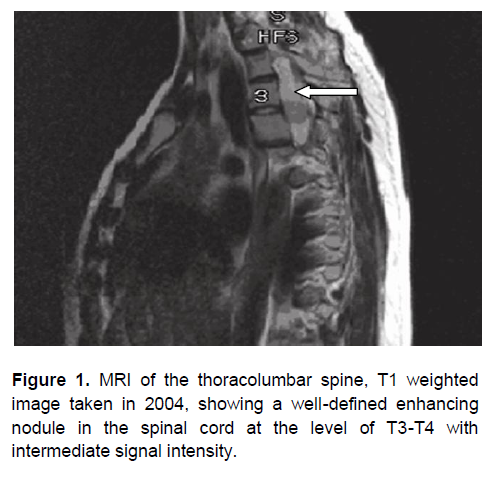 Figure 1. MRI of the thoracolumbar spine, T1 weighted image taken in 2004, showing a well-defined enhancing nodule in the spinal cord at the level of T3-T4 with intermediate signal intensity.
