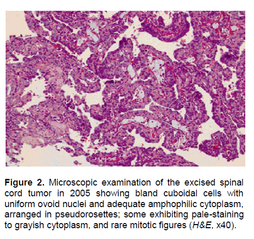 Figure 2. Microscopic examination of the excised spinal cord tumor in 2005 showing bland cuboidal cells with uniform ovoid nuclei and adequate amphophilic cytoplasm, arranged in pseudorosettes; some exhibiting pale-staining to grayish cytoplasm, and rare mitotic figures (H&E, x40).