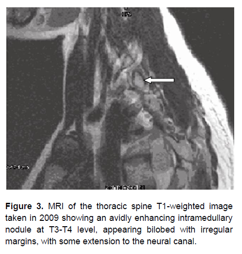 Figure 3. MRI of the thoracic spine T1-weighted image taken in 2009 showing an avidly enhancing intramedullary nodule at T3-T4 level, appearing bilobed with irregular margins, with some extension to the neural canal.
