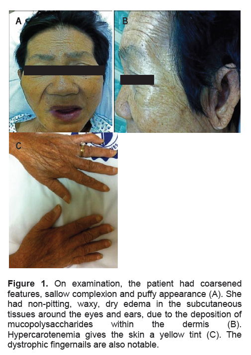 Figure 1. On examination, the patient had coarsened features, sallow complexion and puffy appearance (A). She had non-pitting, waxy, dry edema in the subcutaneous tissues around the eyes and ears, due to the deposition of mucopolysaccharides within the dermis (B). Hypercarotenemia gives the skin a yellow tint (C). The dystrophic fingernails are also notable.