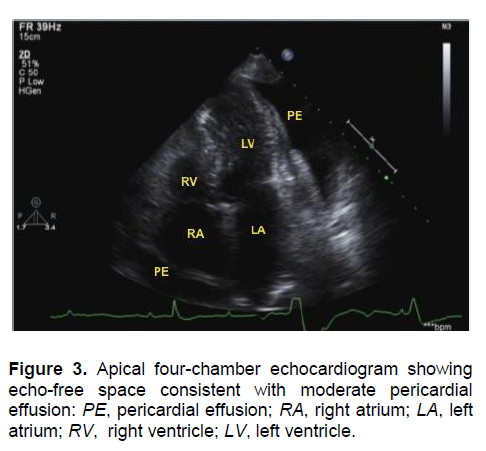 Figure 3. Apical four-chamber echocardiogram showing echo-free space consistent with moderate pericardial effusion: PE, pericardial effusion; RA, right atrium; LA, left atrium; RV, right ventricle; LV, left ventricle.