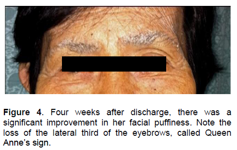Figure 4 . Four weeks after discharge, there was a significant improvement in her facial puffiness. Note the loss of the lateral third of the eyebrows, called Queen Anne’s sign.