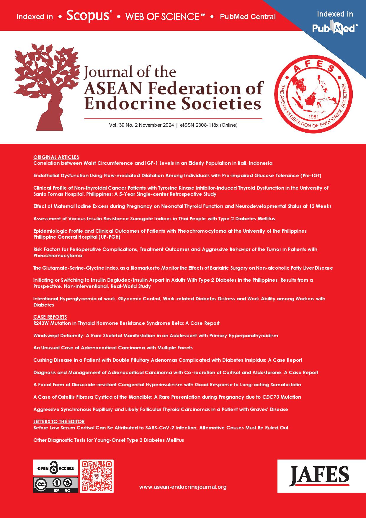 To request permission to translate, reproduce, download, or use articles or images for commercial reuse or business purposes from the Journal of the ASEAN Federation of Endocrine Societies (JAFES), kindly complete the Permission Request for Use of Copyrighted Material Form and email jafes@asia.com or jafes.editor@gmail.com.
